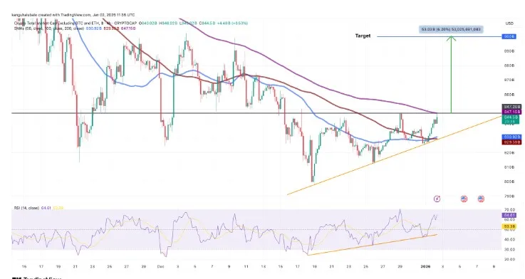 Currently, TOTAL3 is testing a key resistance level around USD 848 billion, which coincides with the 200-day moving average and a medium-term trendline. If this level is broken with sufficient volume and holds, the technical target could extend toward USD 900 billion, providing room for continued rebounds in altcoins and meme coins.