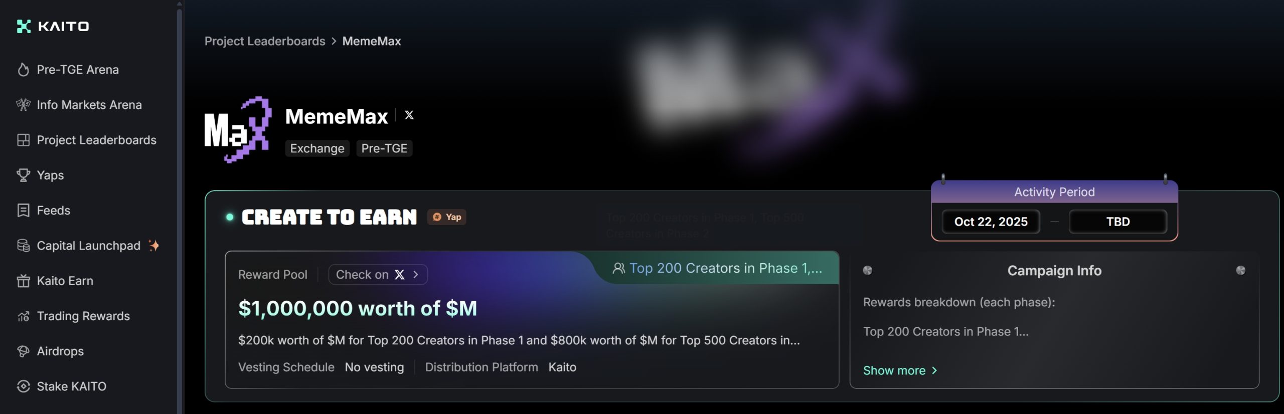 From the left menu, choose Project Leaderboards, then select MemeMax. You’ll find the activity rules, ranking format, and rewards.