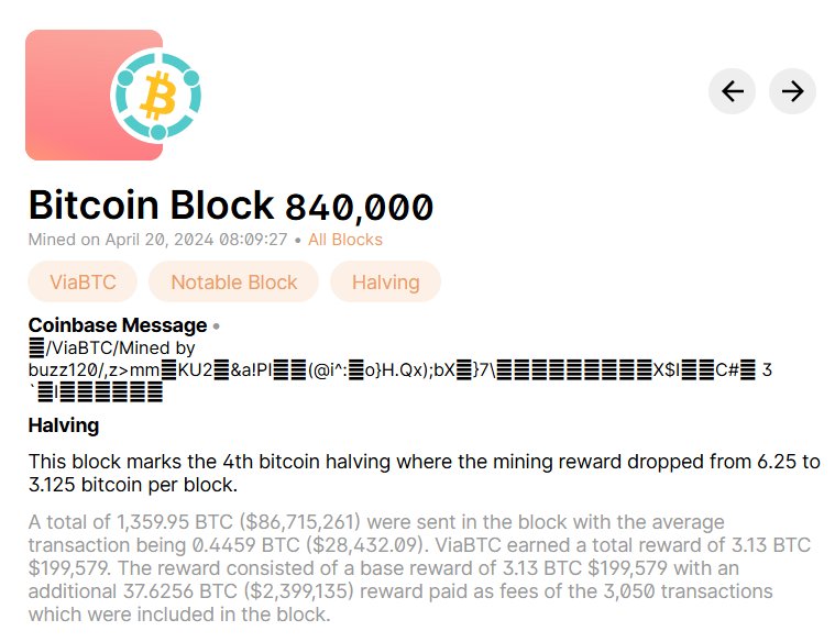 Bitcoin’s fourth block reward halving took place on April 20, 2024, at block height 840,000, when the block subsidy was reduced from 6.25 BTC to 3.125 BTC, in accordance with Bitcoin’s protocol-defined issuance schedule that triggers a halving every 210,000 blocks.