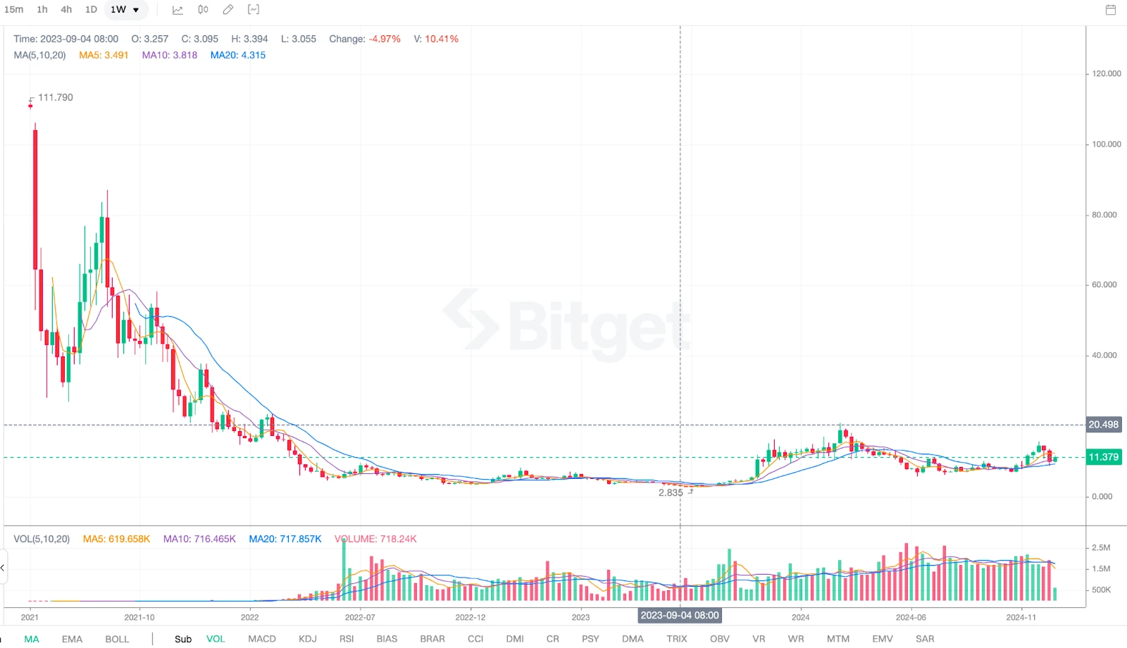As one of the most prominent public chain projects from the previous halving bull market, DOT’s first target should be entering the top 10 by market cap. Currently, the 10th position is held by TRX at $22.13 billion, representing a potential 93.9% increase for DOT. The second target would be top 5, currently held by BNB at $101.5 billion, representing a potential 790% increase.