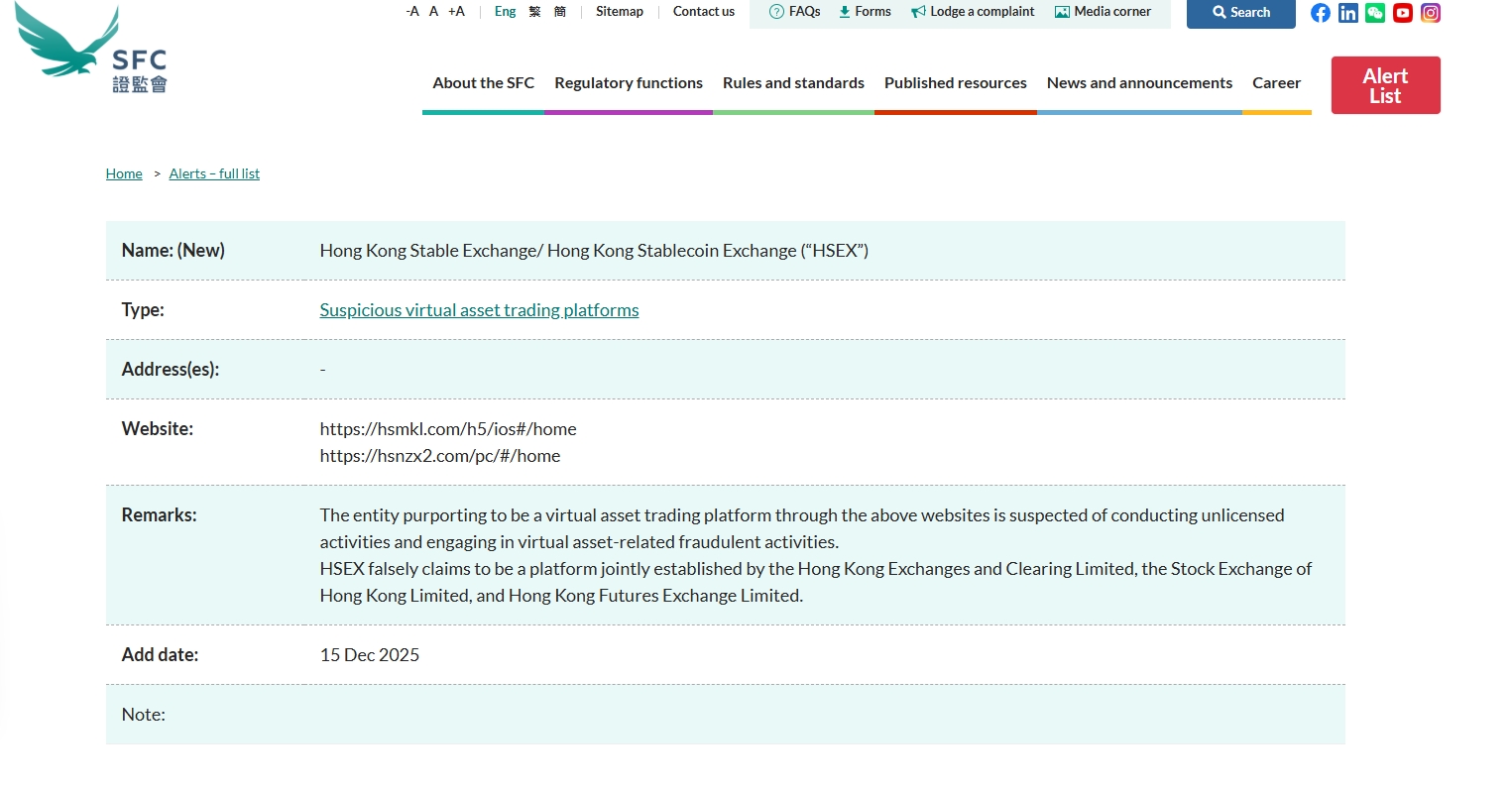 Hong Kong’s Securities and Futures Commission added the “Hong Kong Stablecoin Exchange” to its alert list of suspicious virtual asset trading platforms in December 2025. The SFC stated that this entity claimed to operate a virtual asset trading platform and was suspected of engaging in unlicensed activities and virtual asset-related fraudulent activities. The entity falsely claimed it was “jointly established by Hong Kong Exchanges and Clearing Limited, the Stock Exchange, and the Futures Exchange,” when in fact it has no connection to any of these three organizations.