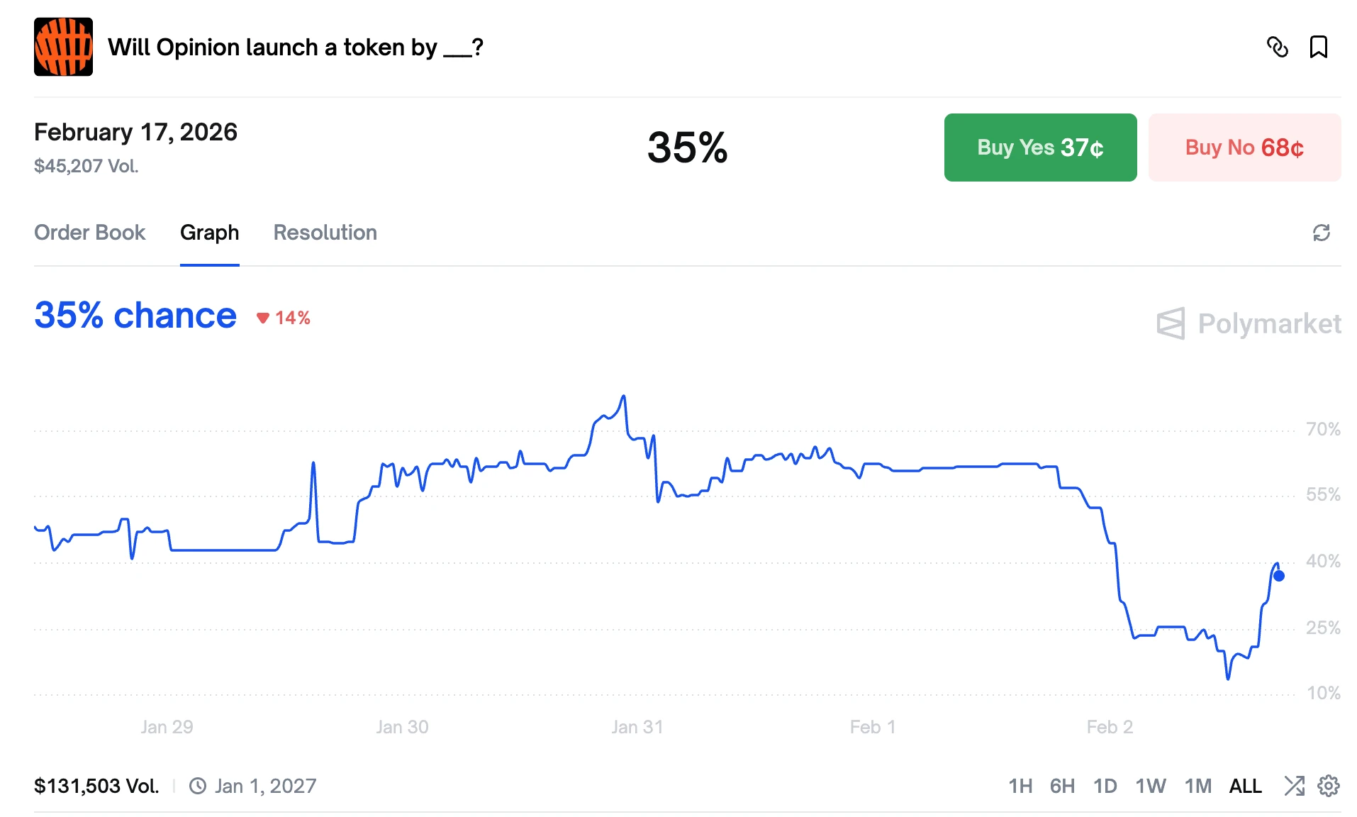 However, following last week’s sharp market downturn, many community members now expect Opinion to delay its TGE. Data from Polymarket shows that the probability of the event “Opinion will officially launch its governance token before February 17” has dropped sharply—from over 70% in late January to a low of below 15%. While the odds have since rebounded, they currently stand at around 35%.