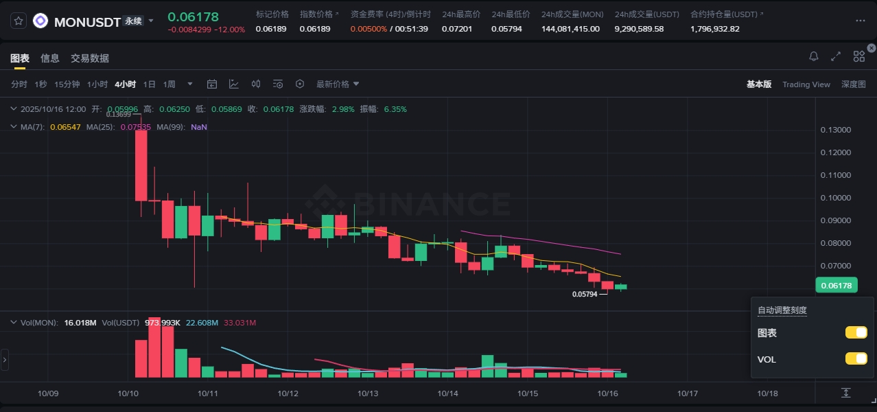 From the moment trading began, MON’s price displayed sharp volatility. In early pre-market trading, MON hovered near $0.08 with strong speculative interest. On Binance perpetuals, the token opened as high as $0.13 but soon fell to around $0.06–$0.07, where it has struggled to stabilize.