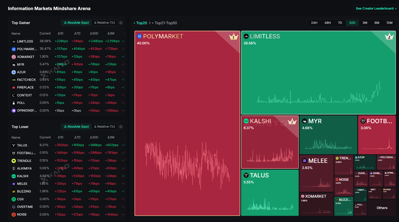 Based on 30 day mindshare rankings, the following projects currently dominate attention within information markets.
