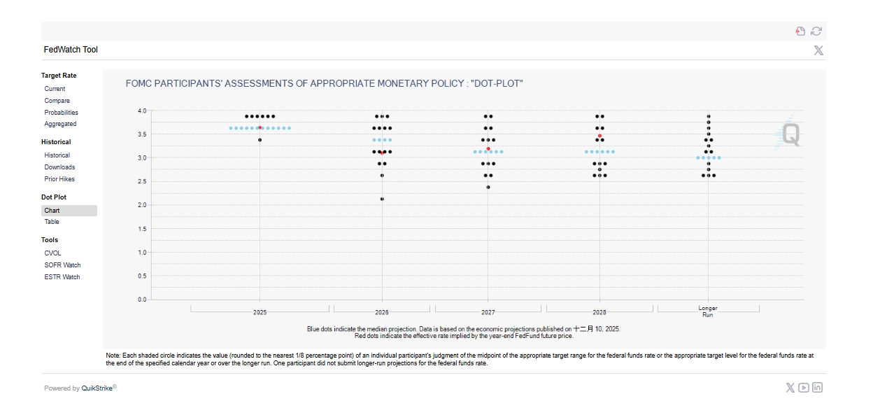 If the dissent was not enough, the updated dot plot pushed markets further toward caution. The projections now indicate only one rate cut in 2026 and another in 2027, leaving the long-run policy rate near 3 percent. This represents a noticeably more restrictive outlook than investors had anticipated. That the projections barely shifted from September’s update—despite softer labor-market data—highlights how far apart committee members have become.
