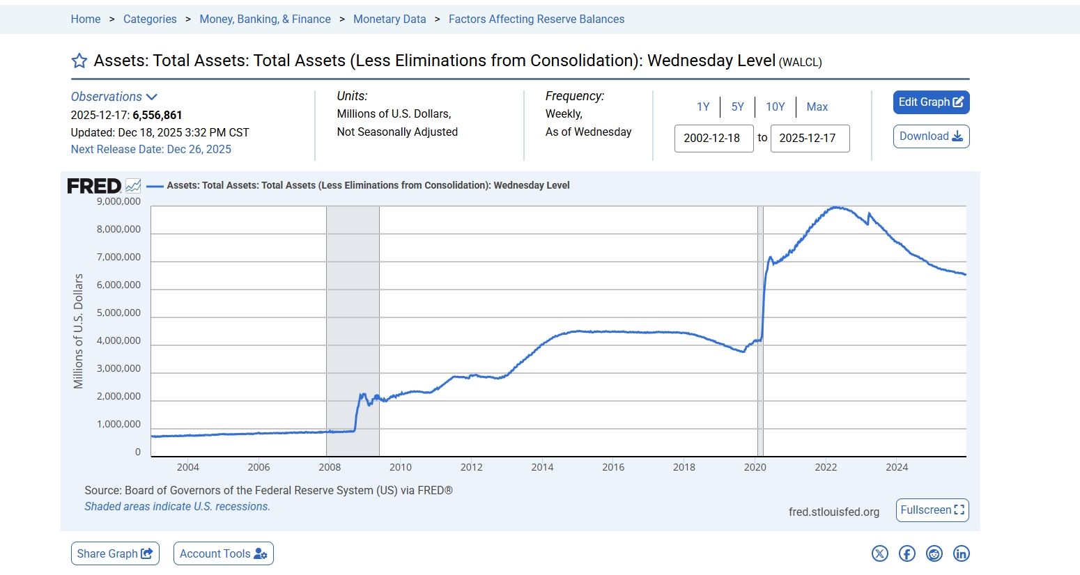 - The central bank’s balance sheet does not show a “flood-like expansion,” and its balance sheet as of December 17, 2025, was $6.5569 trillion.