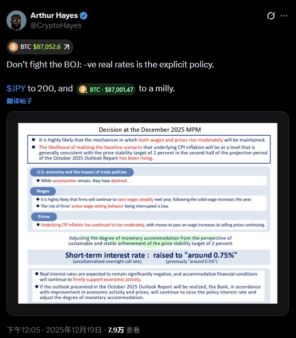 Beyond crypto-native voices, macro-focused commentators have also weighed in. Arthur Hayes offered a particularly blunt interpretation of Japan’s policy stance. He argued that investors should not underestimate the BOJ’s tolerance for negative real rates, suggesting that Japan’s tightening does not represent a true shift toward restrictive monetary policy.