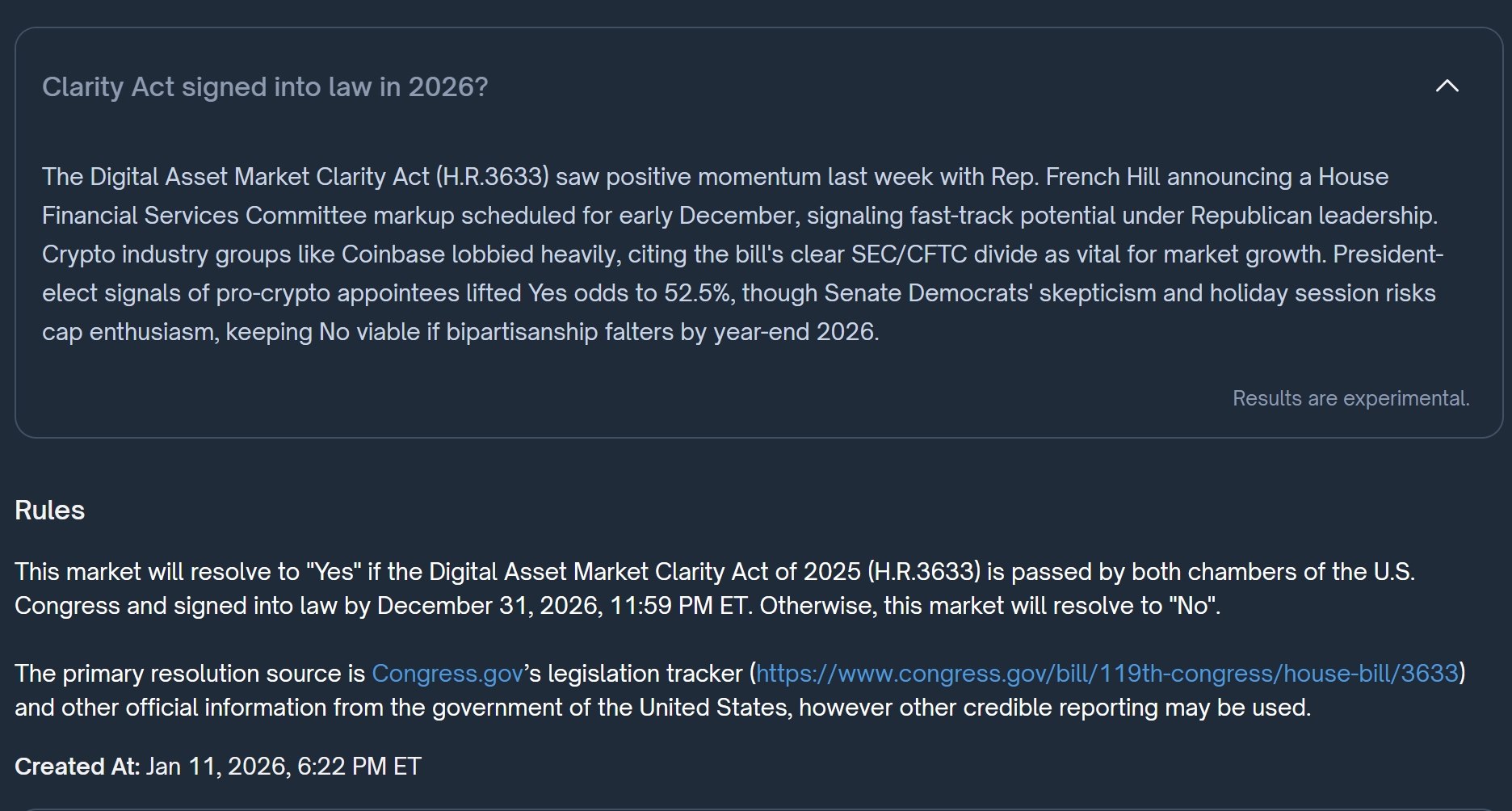 This second article shifts the lens from policy design to probability. The question is no longer whether the Clarity Act is important, but whether it will actually become law—and whether the market is pricing that outcome correctly. That question is now being actively traded on prediction markets, where participants are forced to translate legislative complexity into a binary outcome: Yes or No.