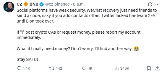 Changpeng Zhao (CZ) warned users on social media not to trust token recommendations from a compromised account, emphasizing the significant security risks of Web2 platform accounts. The Binance team later confirmed the account had been recovered and issued additional security notices to warn users against fraud, preventing further escalation.