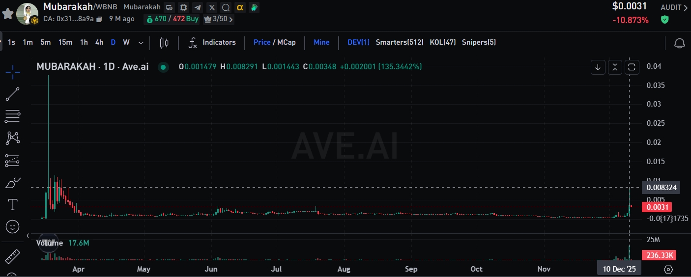 Several analytics firms pointed out that two new wallets purchased around USD 19,000 worth of MUBARA hours before the promotion. The token then surged rapidly, at one point rising more than 200%, followed by notable sell-offs at the top, with some profits exceeding USD 40,000. On-chain behavior presented a classic “pre-positioning → information trigger → pump → sell-off” pattern.