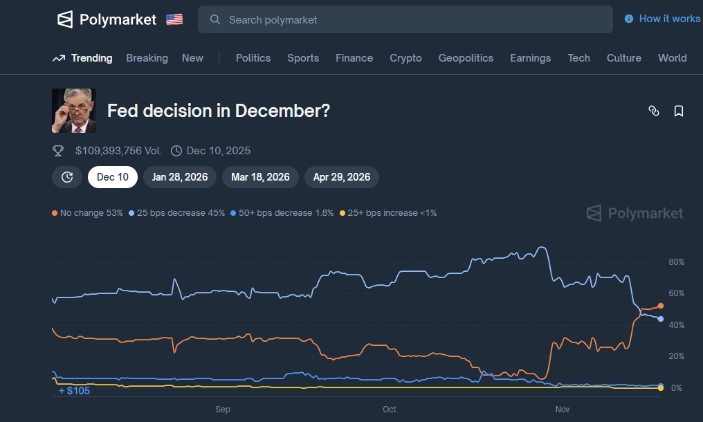 The probability of no rate cut in December has risen sharply, now reflecting the dominant expectation across both traditional markets and prediction platforms. Despite recent political noise, traders appear more focused on data and central bank communication.