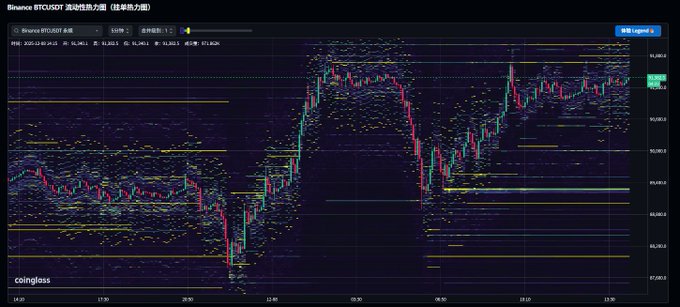The imbalance becomes even more pronounced on heatmap data. Between 91,800 and 92,200, a dense zone of sell liquidity forms a clear overhead barrier. In contrast, the strongest concentration of buy interest sits materially lower — around 89,400, where a large liquidity wall appears.