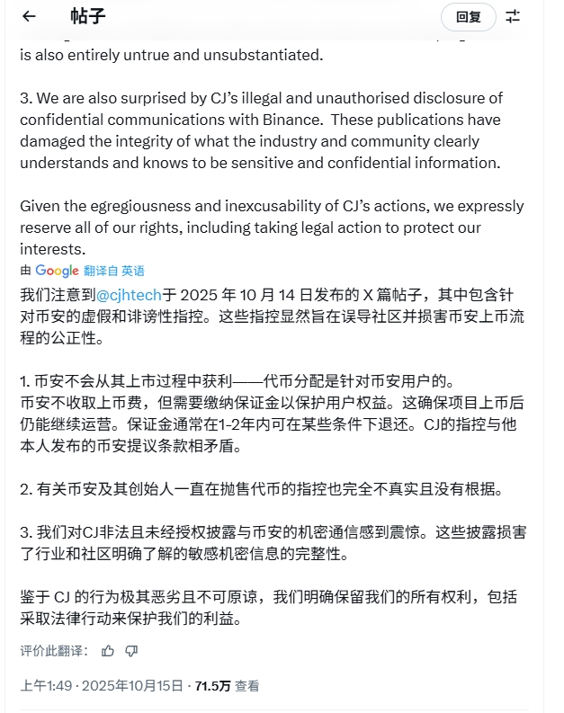 The exchange issued an official statement rejecting CJ’s claims as false and misleading, insisting that Binance does not charge any listing fees. Instead, it explained that the so-called “fees” were refundable security deposits meant to ensure that projects maintain operational standards and fulfill post-listing commitments. Binance also stressed that listing decisions are based on a project’s technical strength, community support, and compliance — not payments or influence.