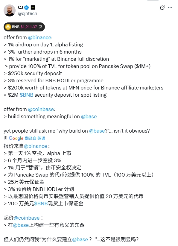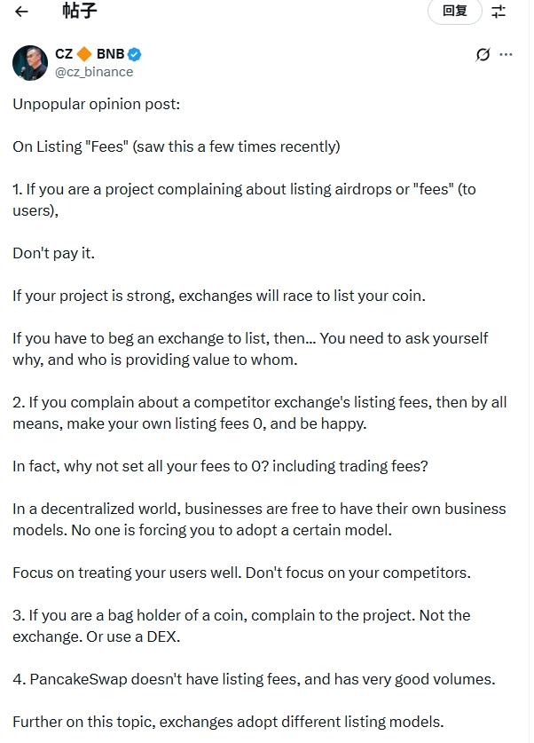 He also suggested that competing exchanges set listing fees to zero, emphasizing that in a decentralized world, companies have the freedom to choose their business models and should prioritize user experience.