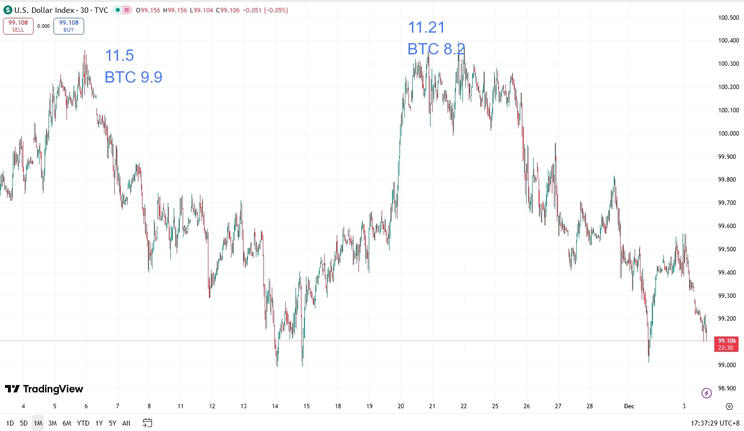 Recent DXY movements did coincide with local BTC bottoms, but the timing was close—almost too close to be used as a reliable early warning tool. Short-term indicators, by definition, only work within a one-month window, so you can’t expect them to behave like precise, real-time market triggers.