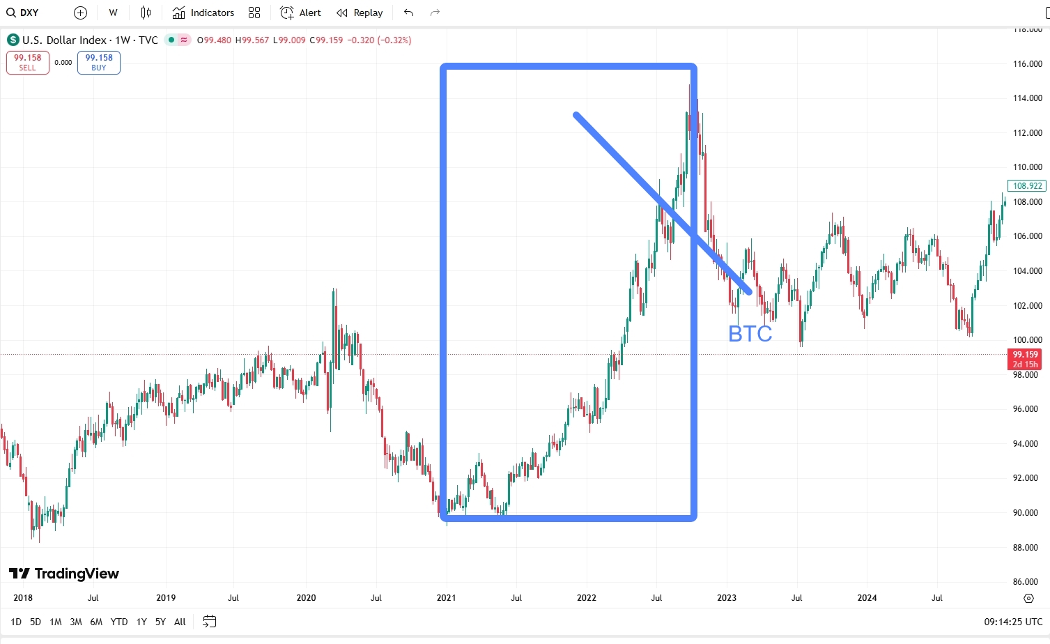 The example becomes even clearer when we look back to 2022, one of the strongest bear-market periods in recent memory. DXY surged relentlessly for most of the year, and crypto unwound almost perfectly alongside it. In that case, the inverse relationship not only worked—it anticipated the trend by roughly three months.