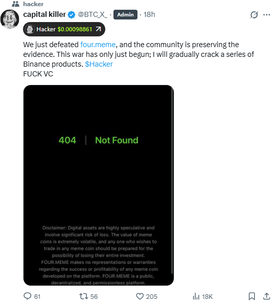 The situation was further amplified by a separate social signal. An X account posted a message claiming: “Today I will launch an attack on four.meme. I will use my newly developed virus injection attack …”