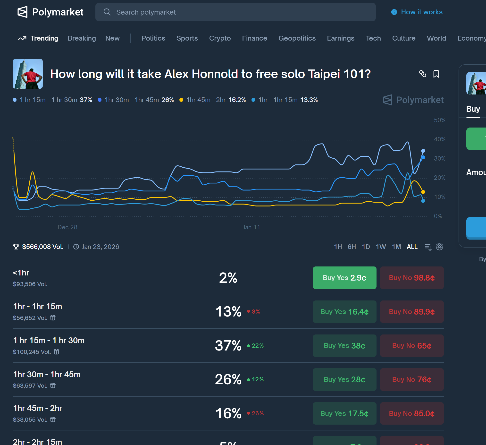 As of January 21, total trading volume on the market has exceeded $310,000. The most popular outcome—backed by 37% of participants—predicts that Alex Honnold will complete the climb within 1 hour 15 minutes to 1 hour 30 minutes. The second-most favored window is 1 hour 30 minutes to 1 hour 45 minutes, accounting for 20% of bets.