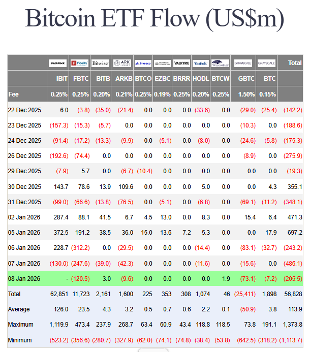 Short-term flows can look like “noise,” but they often reveal positioning stress. On Jan. 7, 2026 (U.S. Eastern Time), U.S. spot Bitcoin ETFs recorded -$486.1M in net outflows, with IBIT at -$130.0M and FBTC at -$247.6M, based on Farside Investors’ daily flow table.