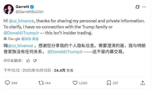 “Hi, CZ — thank you for sharing my personal information. To clarify, I have absolutely no relationship with the Trump family or Donald Trump Jr. This is not insider trading. The fund in question doesn’t belong to me; it belongs to my clients. We operate validator nodes and provide them with internal research and insights.”