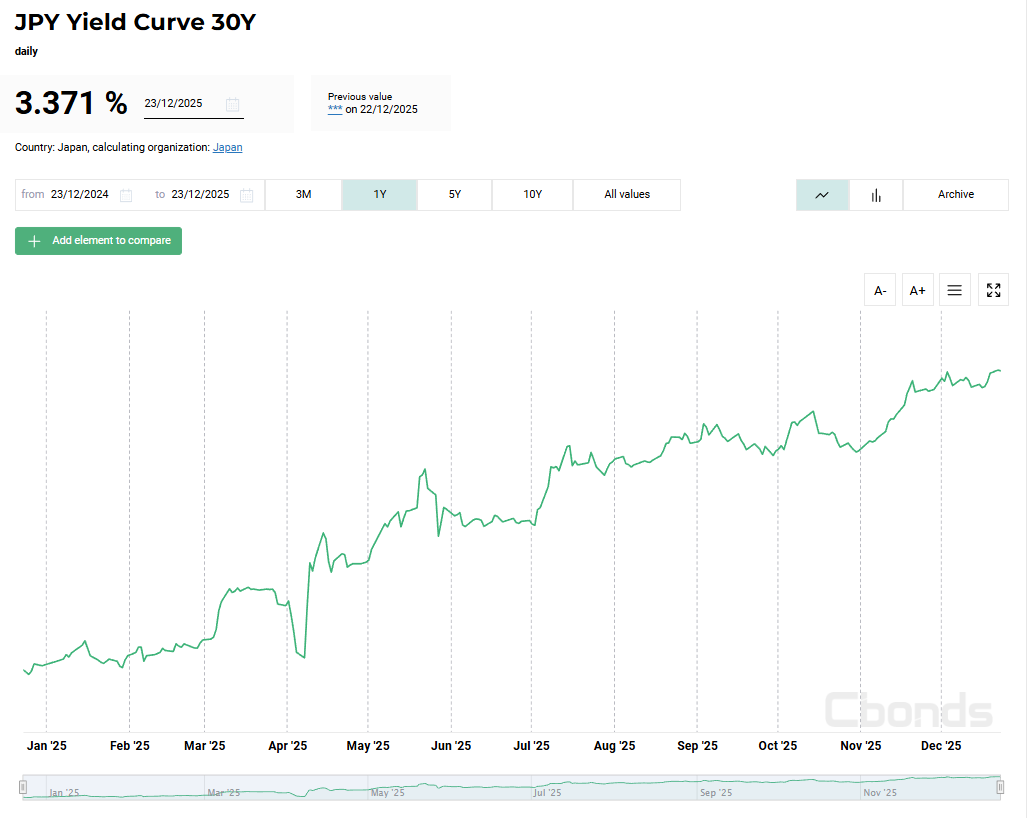 The yield on Japan’s 30-year government bond rose to approximately 3.45%, marking an all-time high. At the same time, the 40-year yield climbed to around 3.715%. This was not a single-day spike, but the continuation of a steady upward trend that began in early November. As yields rose, prices of ultra-long-dated bonds declined noticeably, and the far end of the yield curve shifted upward.