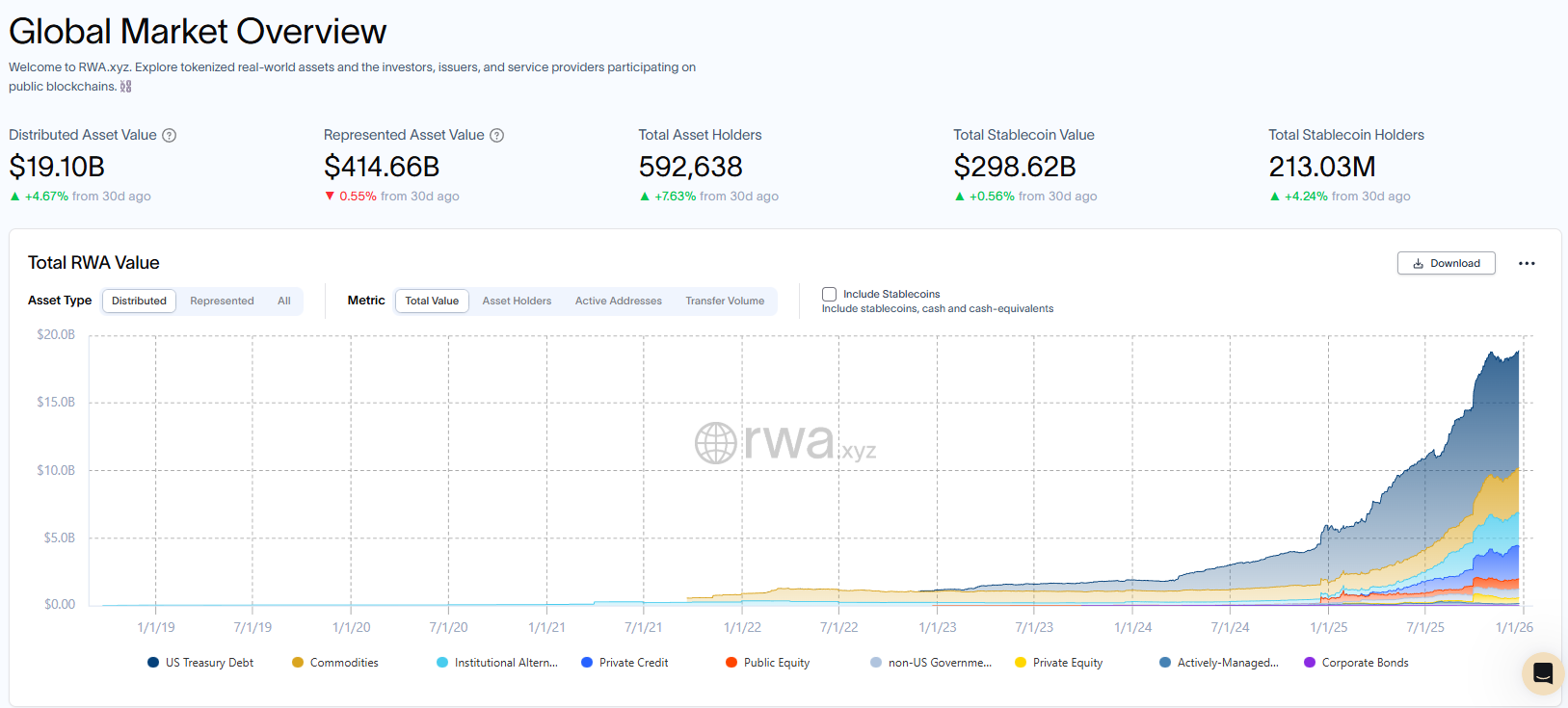 According to RWA.xyz, as of December 25, 2025, the platform reports a Distributed Asset Value of USD 19.10 billion, a Represented Asset Value of USD 414.66 billion, and 592,638 total asset holders, providing a verifiable snapshot of the on-chain RWA market at that point in time.