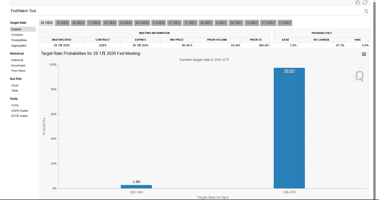 Overlaying tariffs and geopolitics is monetary policy, specifically the Federal Reserve’s January meeting. Market expectations are unusually aligned: investors broadly anticipate no interest rate cut this week.