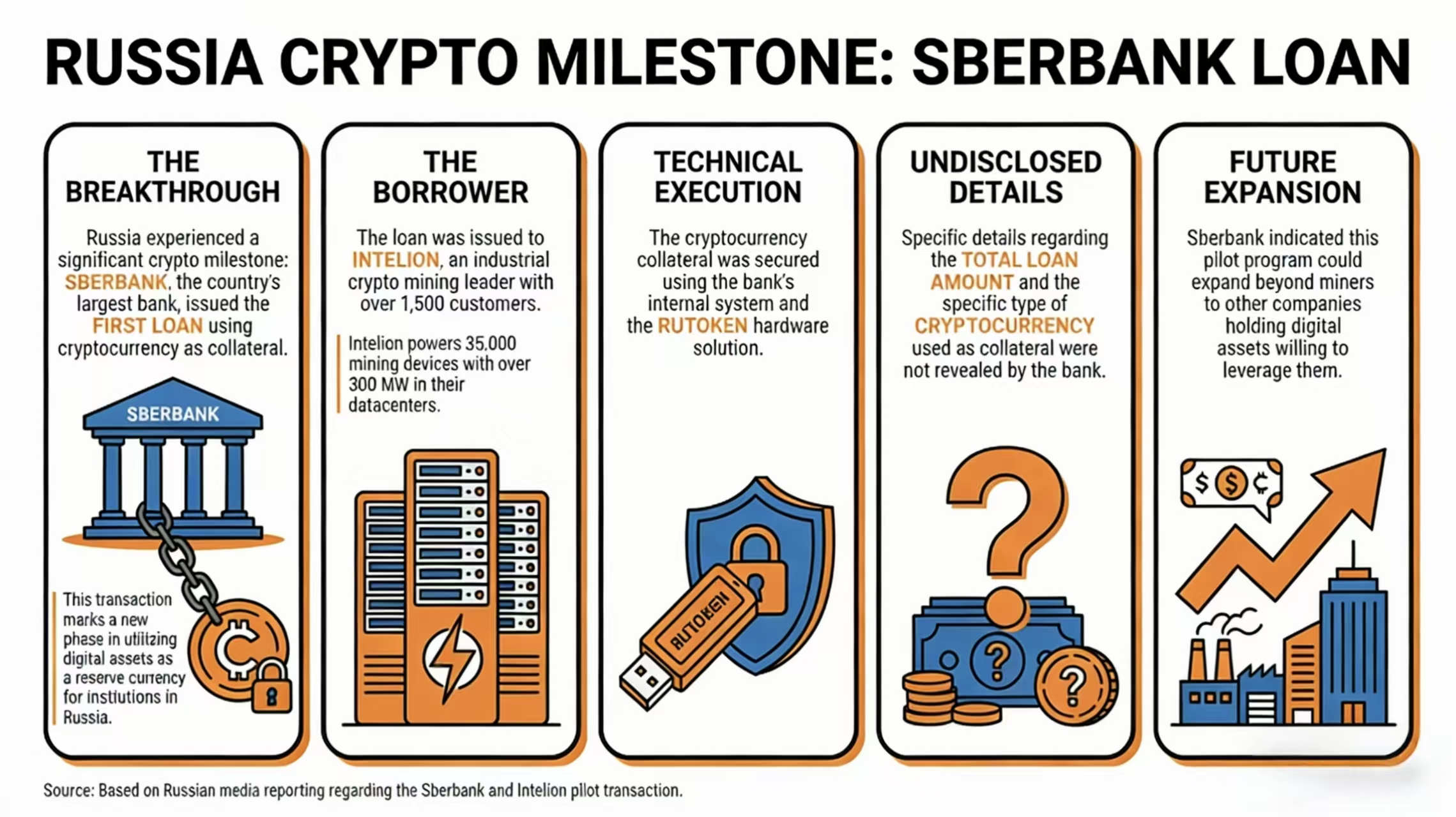 On December 28, 2025, Russia’s largest bank, Sberbank, issued a pilot loan to Bitcoin mining firm Intelion Data using dynamically produced crypto assets as collateral, marking the first on-chain asset creditization practice within Russia’s traditional banking system.