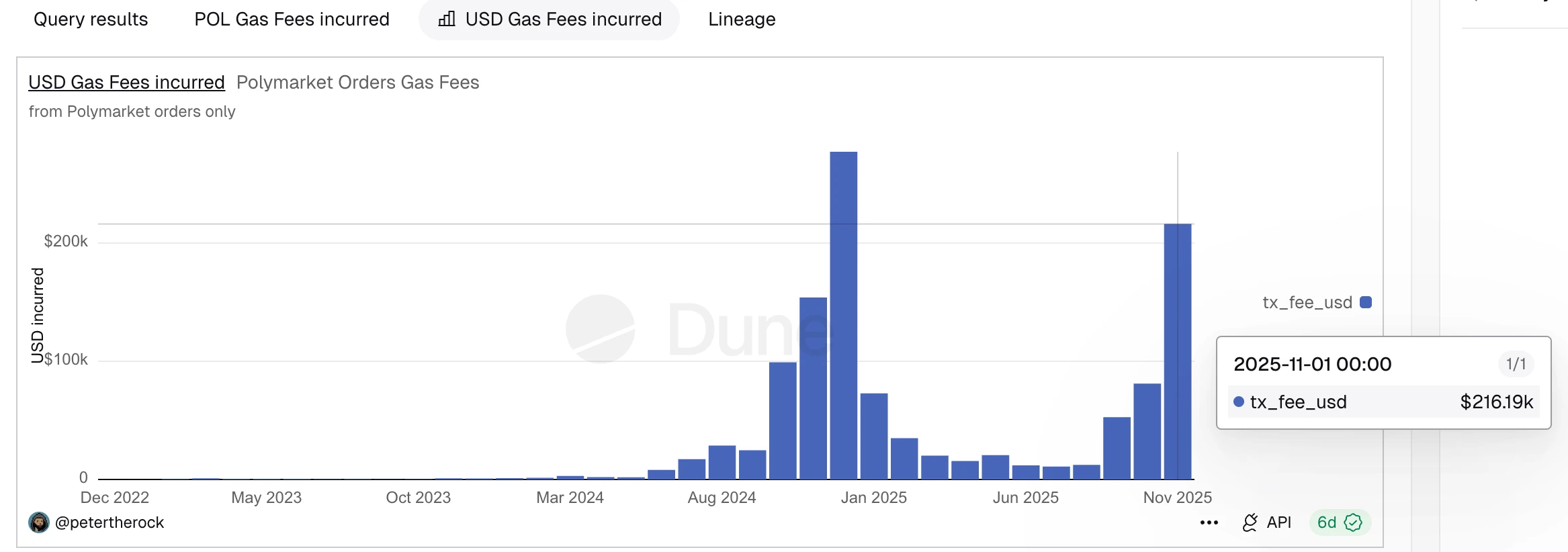 Since that dataset is somewhat dated, we also checked more recent figures. Dune analyst petertherock shows that in November, Polymarket-related transactions consumed roughly $216,000 in gas, while Token Terminal estimates Polygon’s total gas spend for the same month at about $939,000—again, close to one quarter (around 23%).