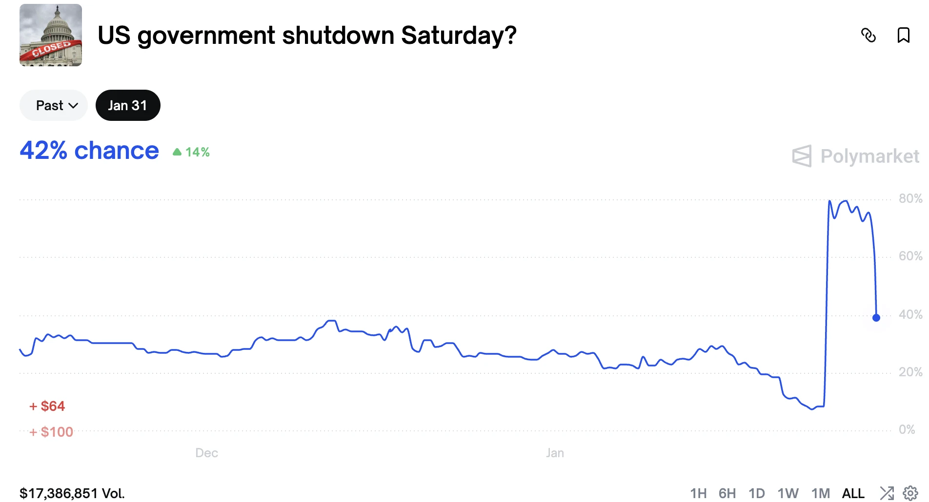 This standoff, combined with the approaching expiration of the temporary funding bill, pushed prediction market odds of a late-January government shutdown sharply higher. However, Polymarket data this morning shows those odds have continued to decline, now falling to 42%, down from a previous peak of around 80%.