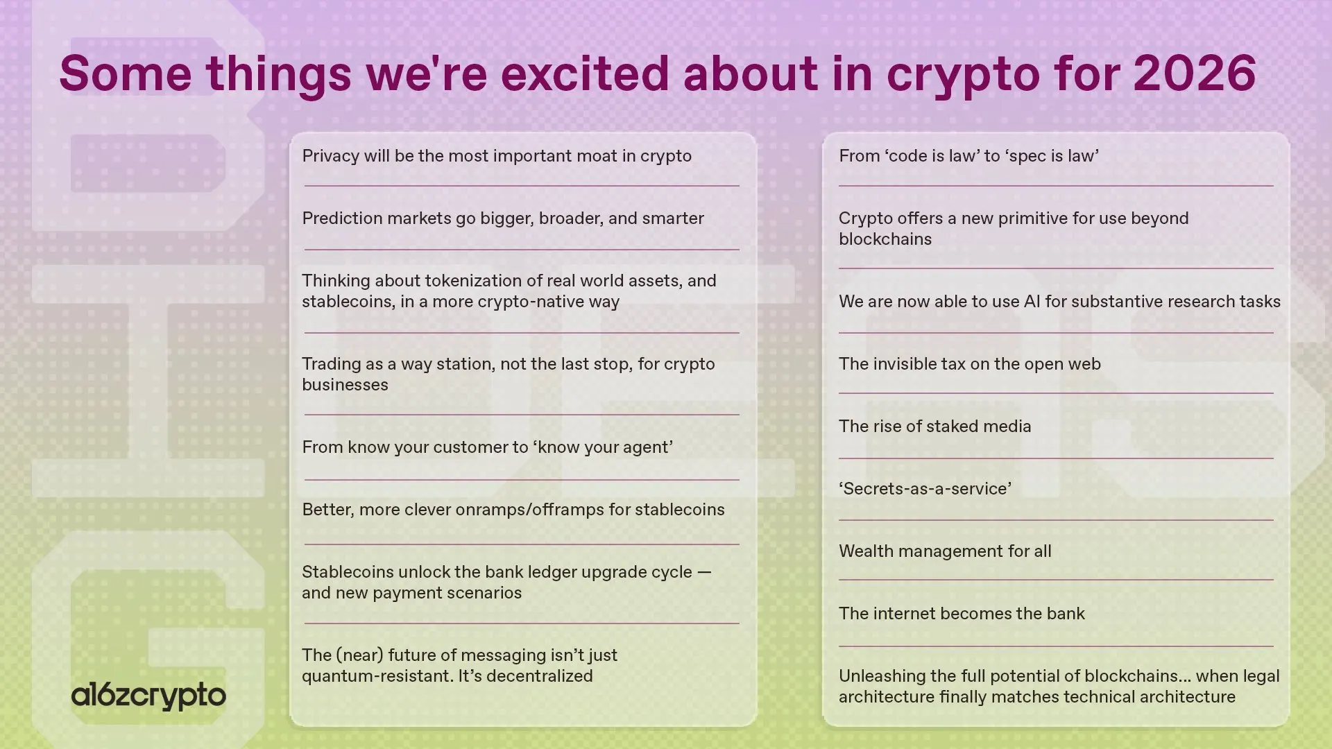 - a16z’s 2026 outlook highlights privacy, stablecoins, AI, and crypto-native financial primitives as long-term structural opportunities.