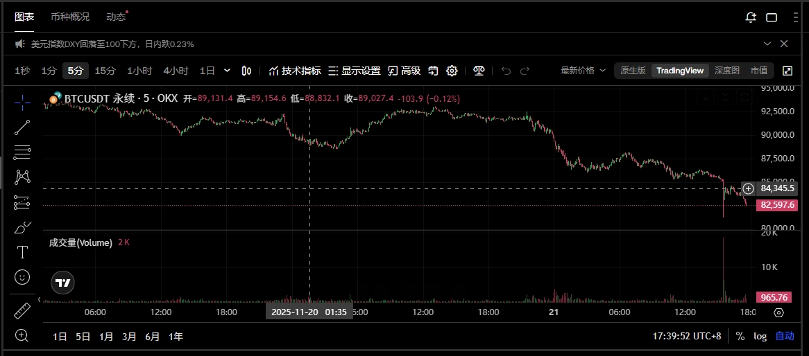 Bitcoin led the decline, breaking below support and falling into the $82,000–$84,000 region before stabilizing modestly. The structure of the move was rapid rather than gradual, with an immediate spike in executed volume once price cut through commonly watched technical levels.